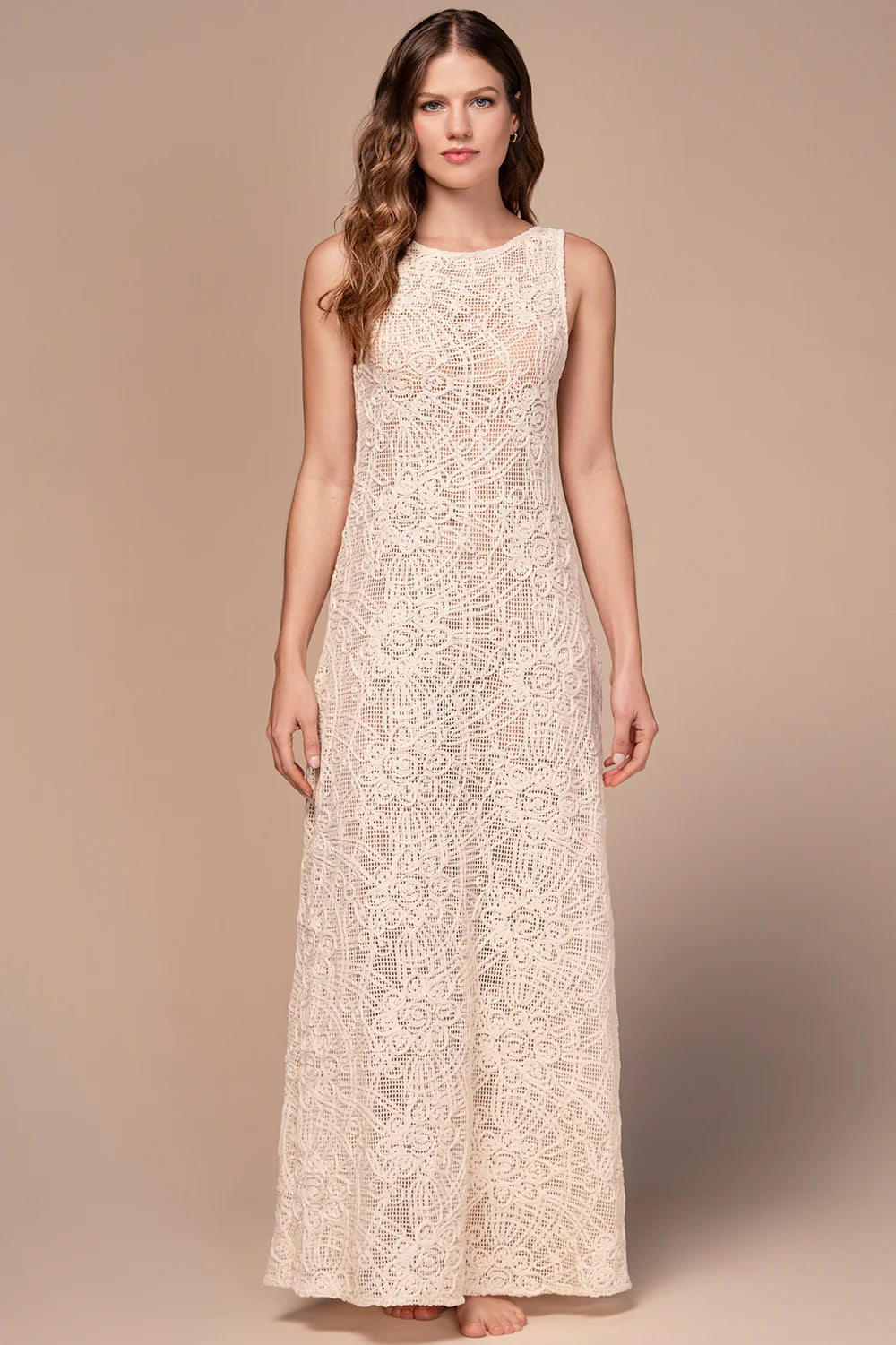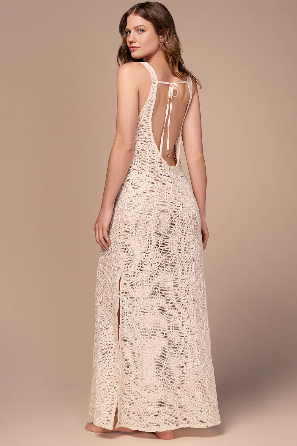 Hermoso traje tejido color crema con detalles bordados, corte en espada que le da un toque sensual y elegante. Cuenta con una apertura en una de las piernas, ideal para utilizar como cover-up la tela estira bastante.