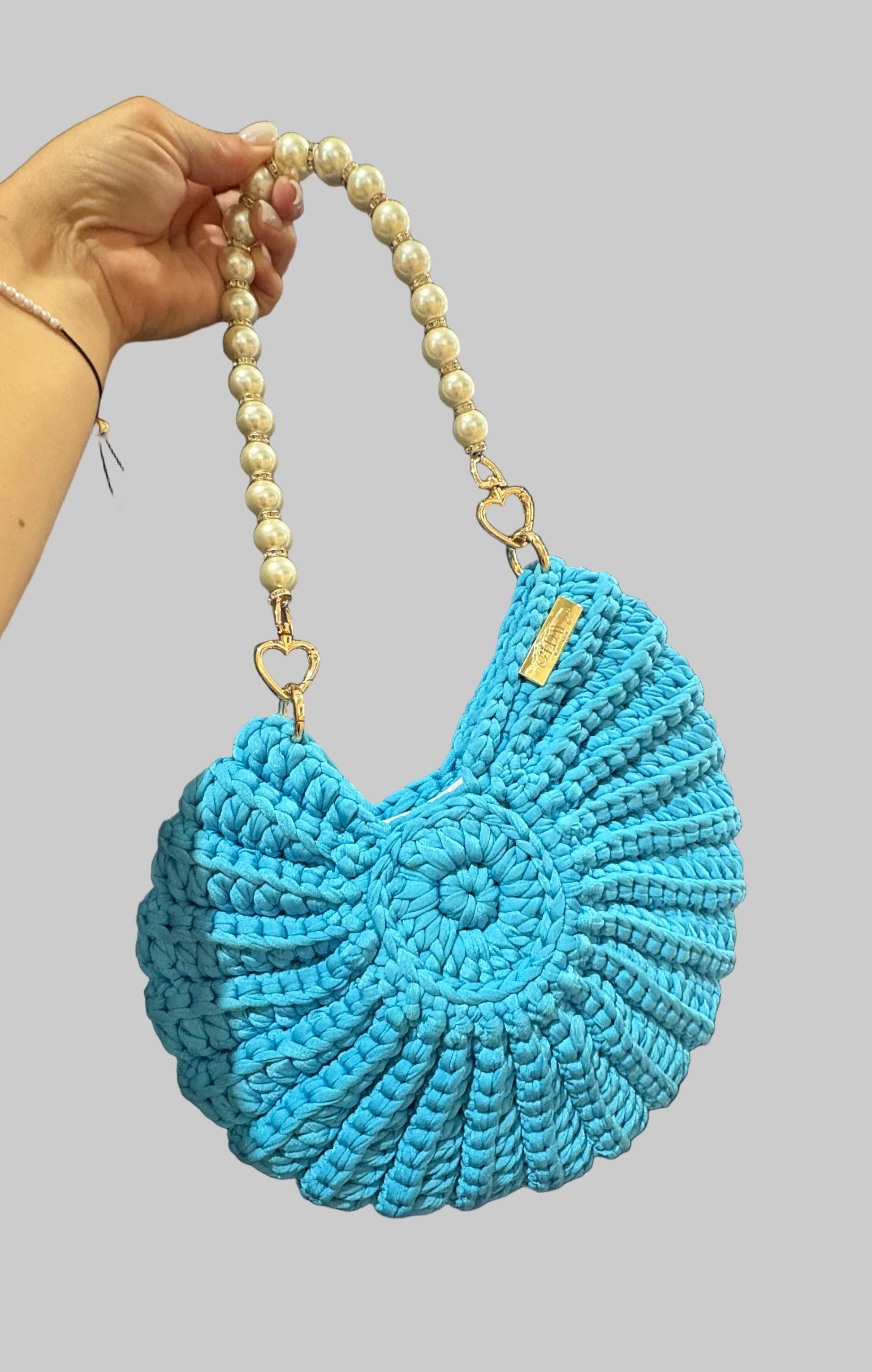 Bolso tejido a mano en tono turquesa con diseño circular tipo concha, ideal para un look veraniego y elegante. Su asa de perlas con detalles dorados y corazones añade un toque chic y sofisticado.