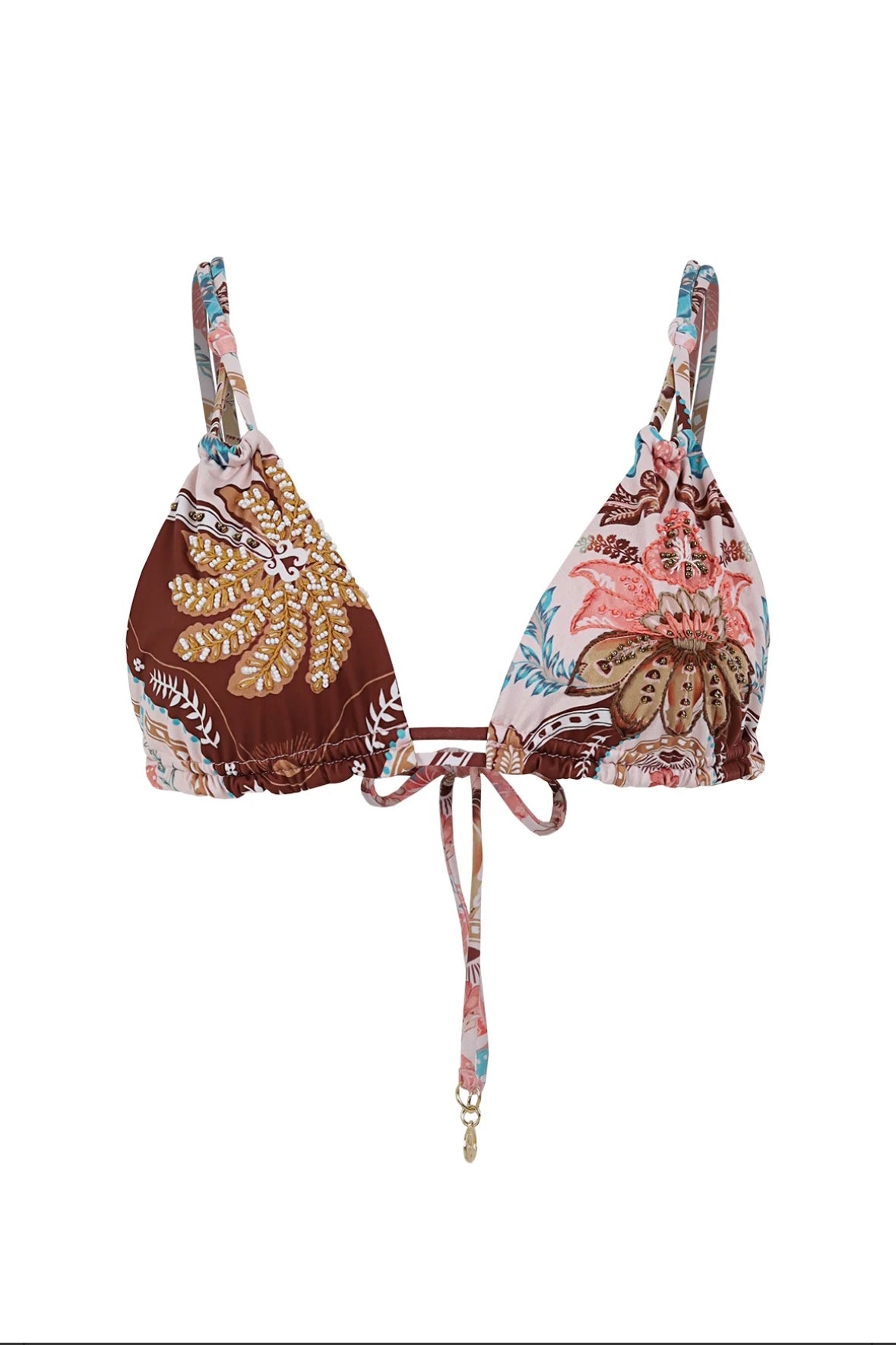 bikini estilo triángulo, que deslumbra con una audaz mezcla de estampados florales y cachemira en tonos tierra y rosados. Sus delicados lazos ajustables y el detalle bordados añaden un toque de encanto bohemio, garantizando todas las miradas en la playa.