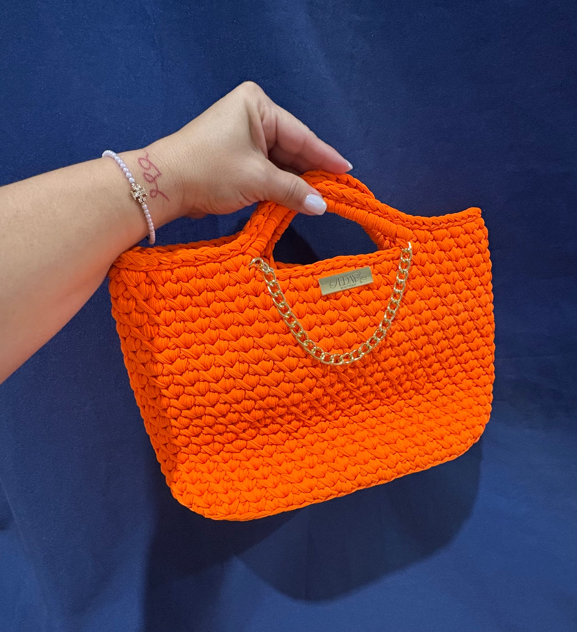 Bolso artesanal elaborado en trapillo color anaranjado, con base acrílica que aporta firmeza y estilo. Su detalle con cadena dorada realza el diseño, creando un toque elegante y moderno perfecto para cualquier ocasión.
